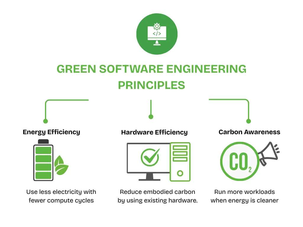 The Green Software Engineering Principles developed by the Green Software Foundation (GSF) and further refined for 2025, to reduce the overall carbon emissions from software applications. These concepts are divided into three main categories: energy efficiency, carbon awareness, and hardware efficiency.